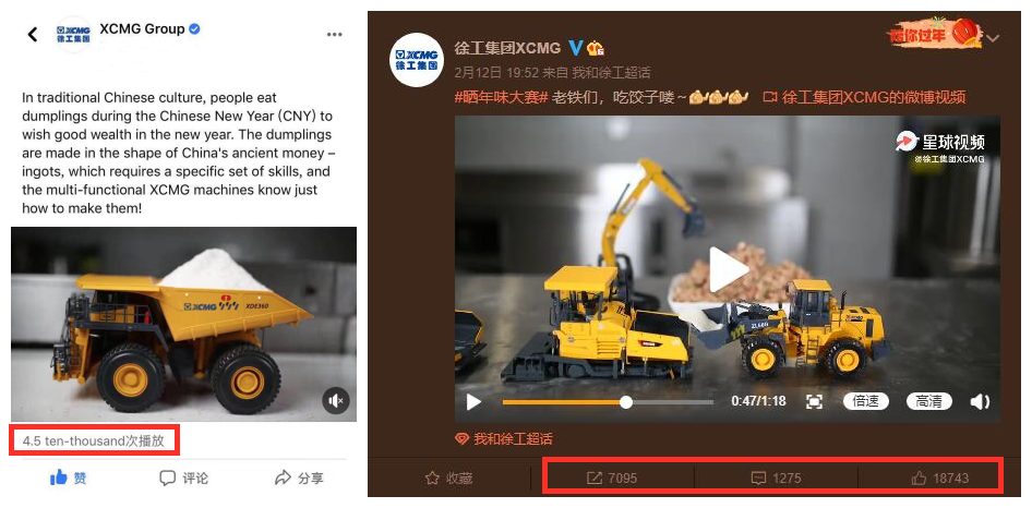 2021年春节期间,徐工制作了一个动画视频,主角是挖掘机、搅拌机、旋挖钻机等工程机械模型,它们分工合作,和面擀皮、包饺子、写春联,憨态可掬,妙趣横生。视频在多个社交平台上被点赞、转发,还被《人民日报》评为年味大赛第二名。