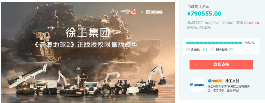 在“造点新货”众筹平台上,徐工和《流浪地球2》推出的联名工程机械合金模型,包括矿卡、挖掘机、装载机、钢铁螳螂等9款,众筹目标2万元,截至2023年2月15日已成交1548笔,累计资金达到79万元。