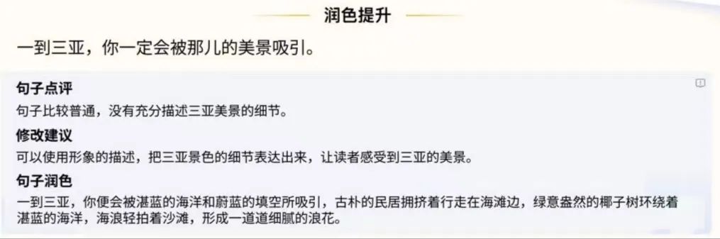 比如,原文是“一到三亚,你一定会被那儿的美景吸引”,小度会建议“把细节勾画出来,让三亚美景跃然纸上。”