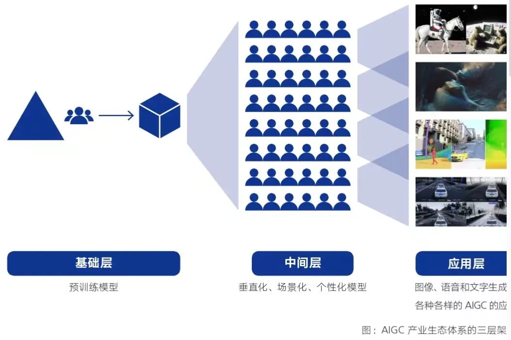 据腾讯研究院近期发布的《AIGC发展趋势2023》报告,目前以ChatGPT为代表的AIGC(AI生成内容)产业生态体系,分为三层构架:以预训练模型为主的基础层;以垂直化、场景化、个性化模型为主的中间层;和以图像、语音、文字生成等具体AIGC应用为主的应用层。