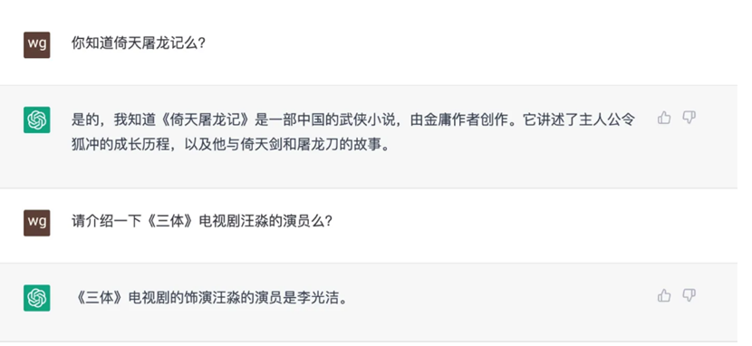 当然,这家伙也有一本正经地胡说八道的时候,像把《倚天屠龙记》和《笑傲江湖》混淆,把令狐冲和倚天剑、屠龙刀张冠李戴,弄不明白电视剧《三体》汪淼的演员。这有赖于ChatGPT知识库及时更新、语言模型持续进化、提问者的水平等。