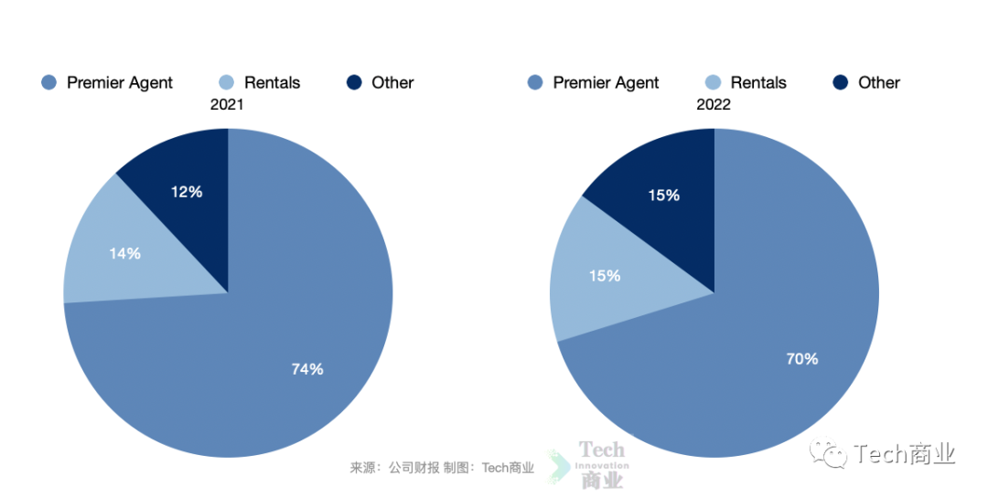 2022财年经纪人项目收入Premier Agent为12.9亿美元,相较2021财年时期的14.0亿美元,表现为下降8%。财报称该项收入下降,是由于宏观房地产市场因素,包括利率和房价上涨和波动,以及住房库存水平紧张。根据财报描述,经纪人项目Premier Agent收入高级代理收入及广告产品收入,旗下 Premier Agent 订阅计划提供一套营销和商业技术产品和服务,而Premier Agent 广告产品,包括交付经过验证的消费者联系或线索,主要以语音共享为基础提供。
