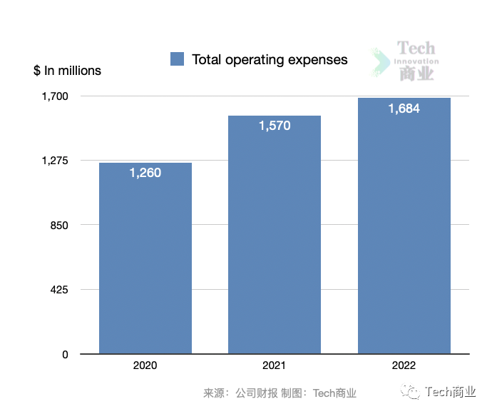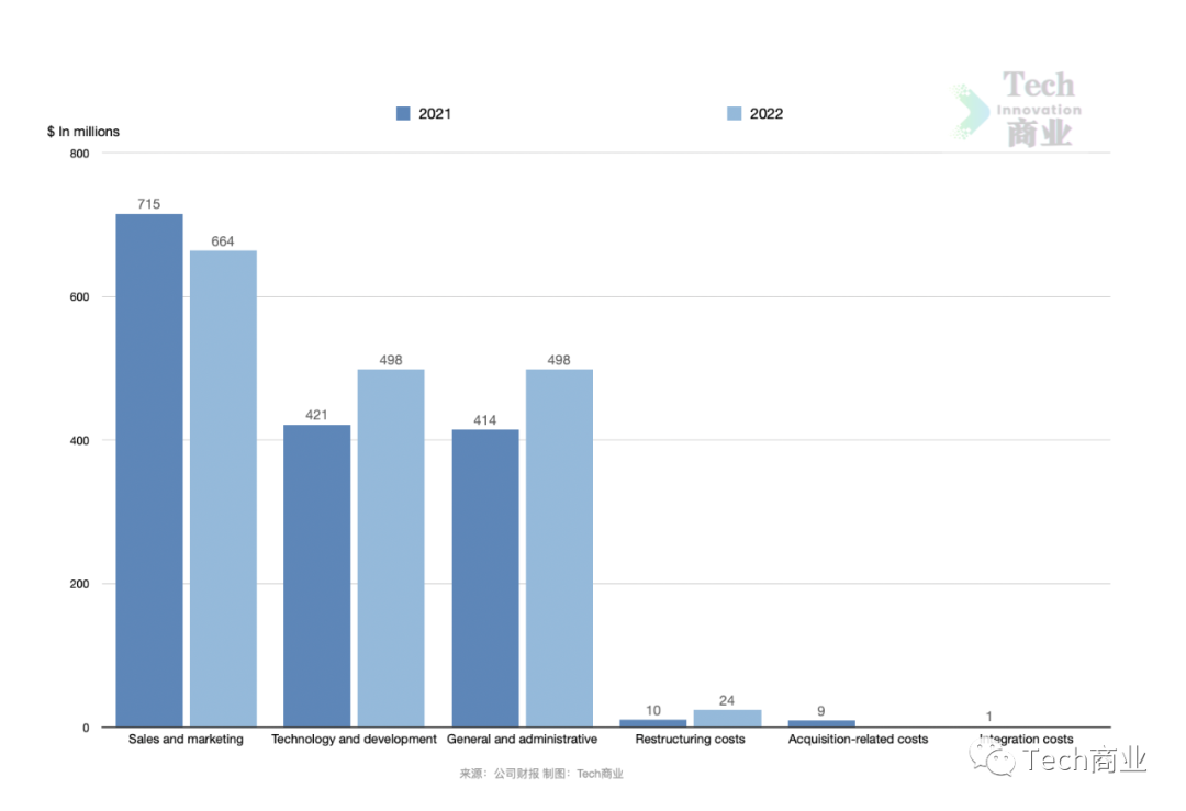 其中本财年销售与营销成本为6.6亿美元,同比2021财年时期的7.2亿美元,该项成本减少7%。技术与研发成本为5.0亿美元,相较上一财年同期的4.2亿美元,该项成本增幅为18%。一般与行政成本为5.0亿美元,同比增幅为20%。