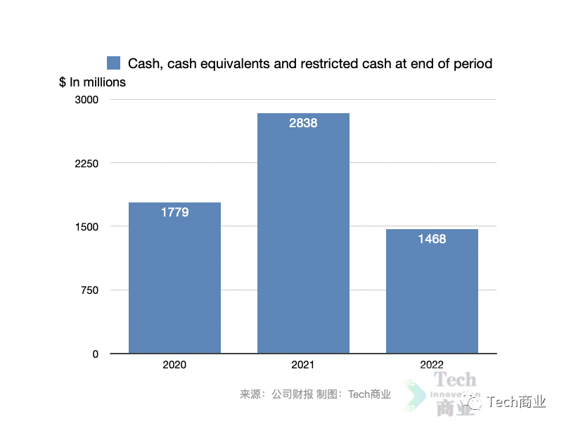 截至本财年该公司现金、现金等价物及受限现金为14.7亿美元,相较2021财年同期的28.4亿美元,该项表现为减少48%。