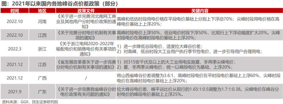 前面提到,终端看政策。2022年12月22日,国家发改委、国家能源局印发《关于做好2023年电力中长期合同签订履约工作的通知》,要求各地制定同本地电力供需和市场建设情况相适应的中长期合同分时段价格形成机制,合理拉大峰谷价差,加强中长期与现货价格机制衔接。自2021年下半年以来,全国已有河南、江西、浙江、河北、山西、广东、山东等超过20个省市调整分时电价政策,要求适度拉大峰谷电价差水平。