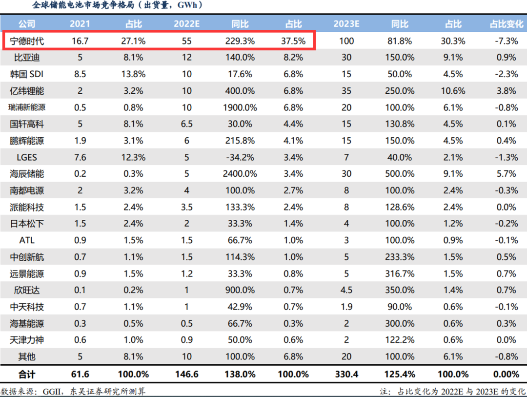 在储能制造业的最后一环——产品端,类似光伏行业的一体化组件企业,其特点是“一超多强”,或者说是一超多不强,宁王一家独大。
