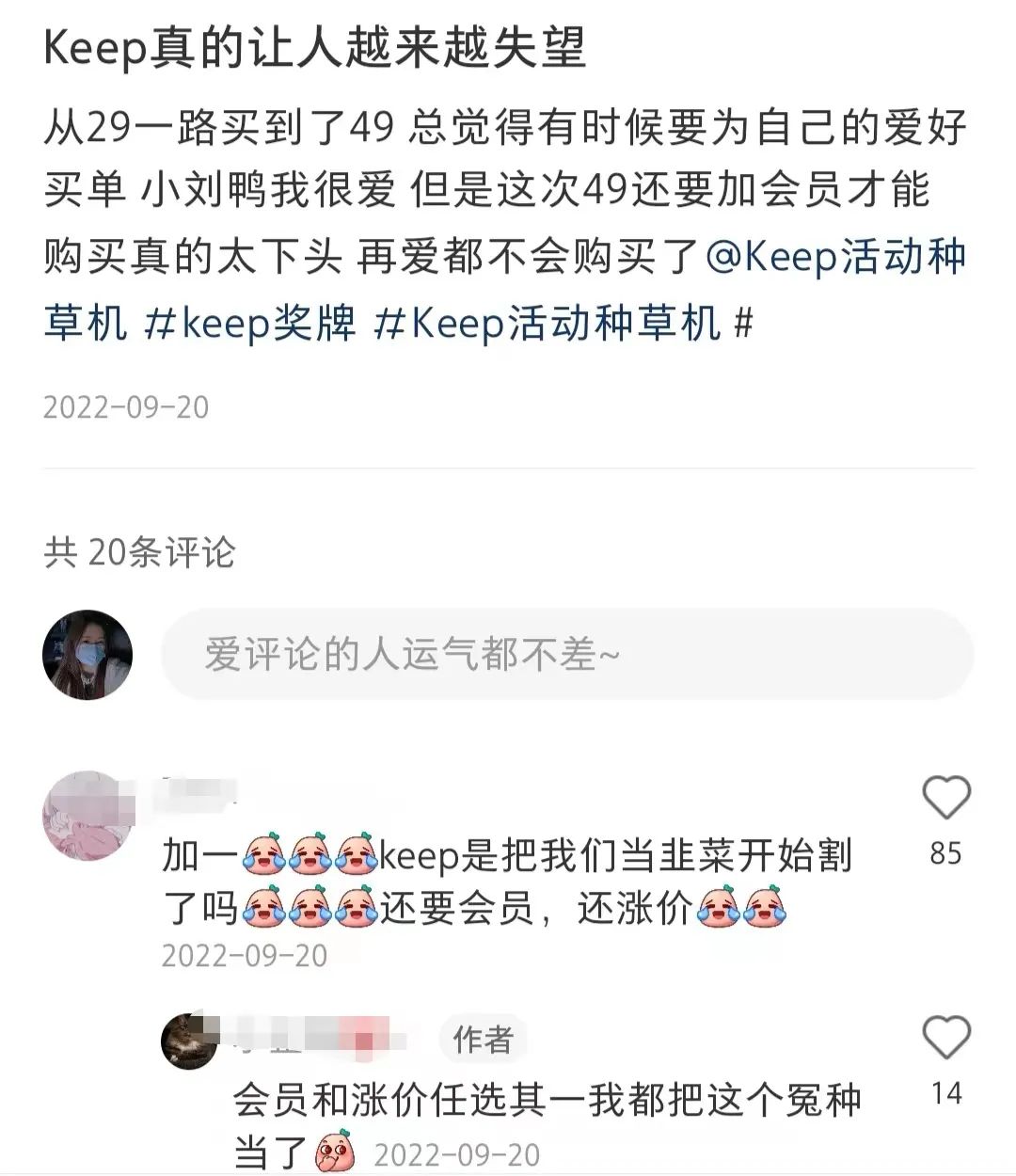 有消费者质疑,Keep是在以一种伤害社区氛围、品牌定位的方式赚钱。在去年9月,就有消费者在社交媒体“控诉”Keep越来越让人失望。奖牌价格从29元一路升至49元,甚至还要开通会员才能购买。