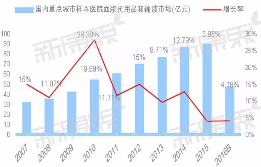 据国内最新数据显示,2015年国内重点城市样本医院输液和血浆代用品已达到了90.52亿元,同比上一年增长率为3.95%,但比2014年的12.79%下降了8.84个百分点。