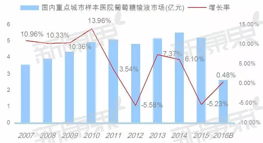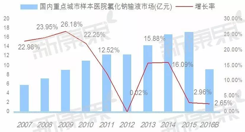 数据显示,2015年国内重点城市样本医院氯化钠输液市场达到了17.29亿元,是输液市场居首位的药物。在加强输液管理后,从2014年高达16%的增长率直线下滑,降到2015年仅为2.96%。在进一步叫停门诊输液形势下,2016年上半年氯化钠输液市场为9.25亿元,预测全年增长率为2.65%。