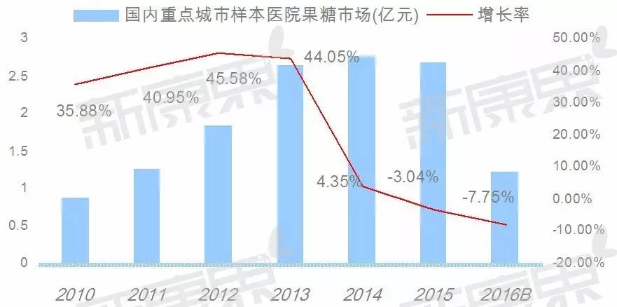 果糖注射液是一种能量和体液补充剂。果糖比葡萄糖更易形成糖原,主要在肝脏通过果糖激酶代谢,易于代谢为乳酸,迅速转化为能量。在门诊输液叫停大形势下,果糖输液也在下滑,数据显示,2015年国内重点城市样本医院果糖输液市场达到了2.69亿元,同比上年下滑了3.04%,而2016年上半年仅为1.24为亿元,预计全年下滑7.75%。