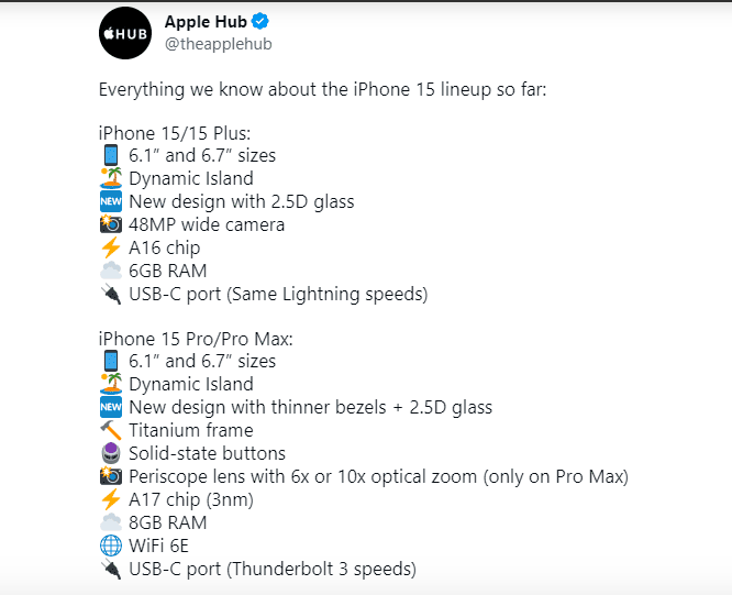 爆料达人 @Apple Hub,对 iPhone 15 全系机型的参数进行了汇总。