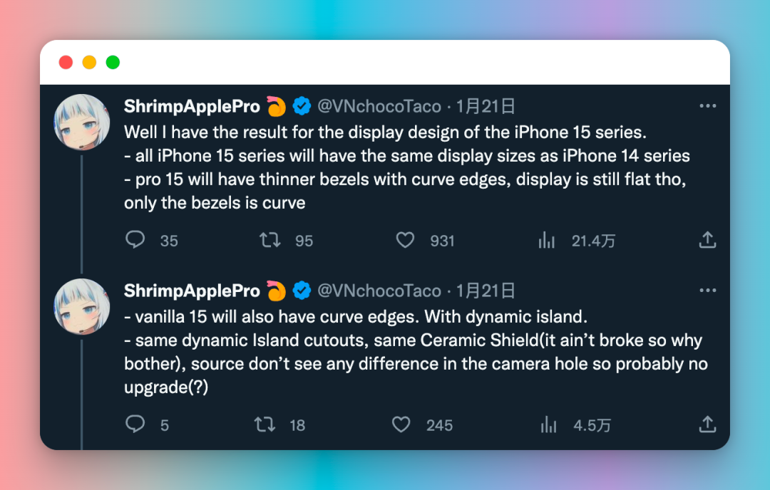 外观设计上的改变,将仅限于 iPhone 15 Pro 机型。