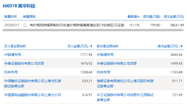 2月17日,昊华科技今日跌9.88%,龙虎榜数据显示,上榜营业部席位全天成交1.36亿元,占当日总成交金额比例为35.21%。其中,买入金额为5637.47万元,卖出金额为7931.77万元,合计净卖出2294.29万元。