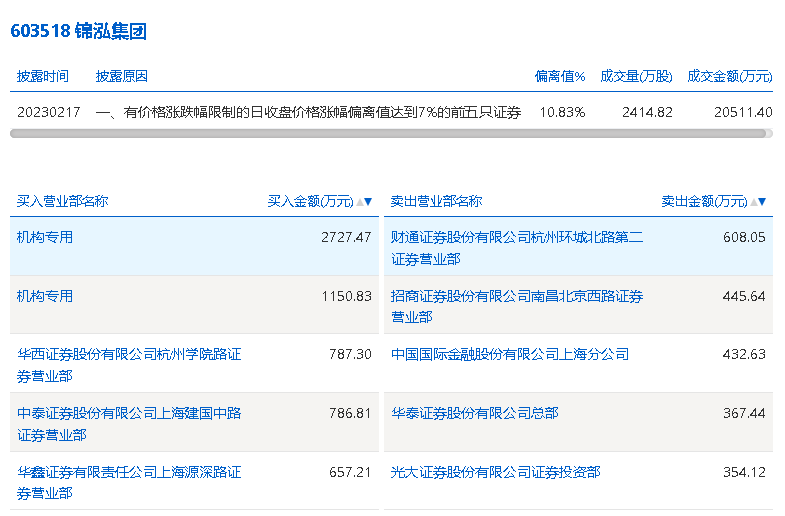 2月17日,锦泓集团今日涨停,龙虎榜数据显示,上榜营业部席位全天成交8317.5万元,占当日总成交金额比例为40.55%。其中,买入金额为6109.63万元,卖出金额为2207.87万元,合计净买入3901.76万元。