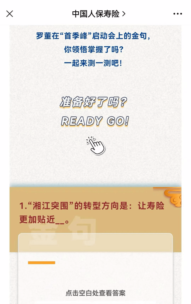 此外,在人保寿险公司官方公众号在1月推送了文章《以考促学,一套题带你牢记“首季峰”金句》,以多道填空题形式考察罗董事长的致辞“金句”;2022年12月2日,推送了《首季峰启动会上,罗熹董事长这些金句值得收藏!》等。