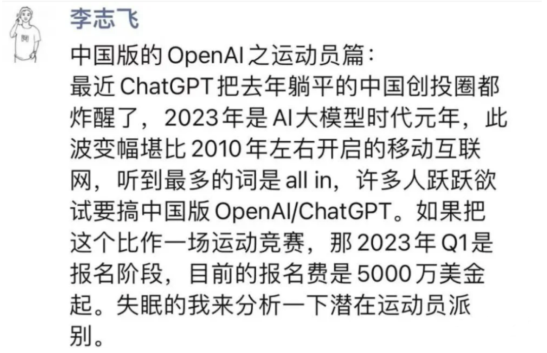 另一边,来自谷歌的前科学家李志飞也开始了隔空喊话,内容同样是有关中国版的OpenAI运动。一时间,ChatGPT好像成了一部通向未来的电梯,不管你是躺着还是站着,最低5000万美元,只要站上去了就能起飞。