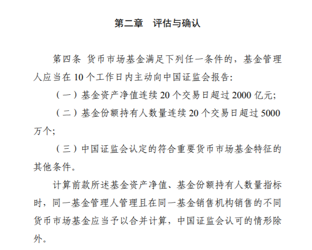从评估条件来看,基金净值规模连续20个交易日超过2000亿元、份额持有人数量连续20个交易日大于5000万个等条件的货币市场基金,应主动向证监会报告。证监会将根据基金资产净值、关联度、可替代性、复杂性等条件,对参评产品予以评估,确定最终名单并予以公示。