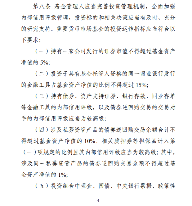 具体到投资运作指标上,《暂行规定》明确: 持有一家公司发行的证券市值不得超过基金资产净值的 5%;投资于具有基金托管人资格的同一商业银行发行的金融工具占基金资产净值的比例不得超过15%;持有债券、资产支持证券、银行存款、同业存单等金融工具的内部信用评级,以及债券逆回购交易的交易对手的内部信用评级应当为较高级;涉及私募资管产品的债券逆回购交易余额合计不得超过基金资产净值的10%;其中,涉及同一私募资管产品的债券逆回购交易余额不得超过基金资产净值的 1%;投资组合中现金、国债、中央银行票据、政策性金融债券以及5个交易日内到期的其他金融工具占基金资产净值的比例合计不得低于 20%;主动投资于流动性受限资产的规模合计不得超过基金资产净值的5%,投资于有存款期限的银行存款的规模不得超过资产净值的 50%;投资组合的平均剩余期限不得超过 90 天;投资组合的杠杆比例不得超过 110%等。