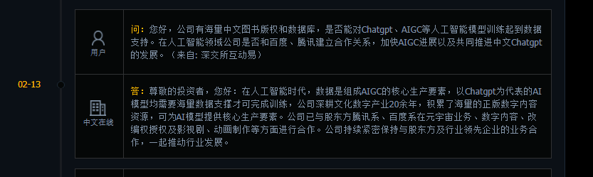 其中,中文在线和AIGC关联起来,又吸引了不少关注。这家数字出版公司在某互动平台表示,数据是组成AIGC的核心生产要素,以ChatGPT为代表的AI模型均需要海量数据支撑才可完成训练,公司积累的海量正版数字内容,可为AI模型提供核心生产要素。