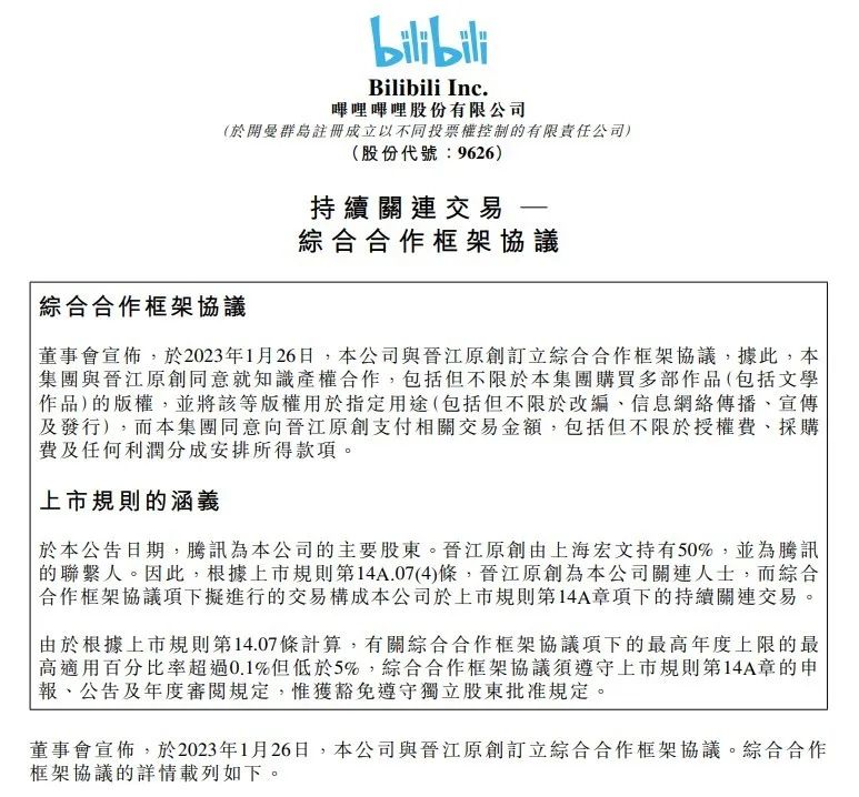 1月下旬B站刚刚发布公告,宣布将与晋江原创订立综合合作框架协议,被解读为B站将进军网文改编,或将在真人剧、动漫方面展开合作。