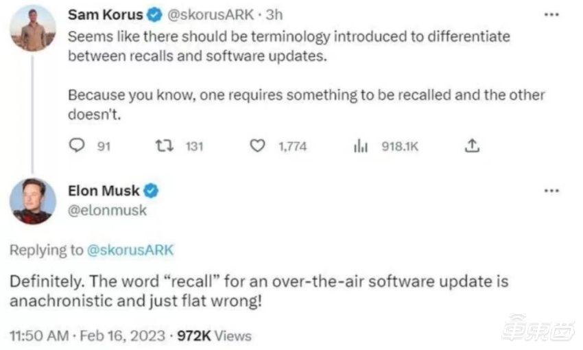 显然,马斯克对于“召回”这个词很是不满,强调这一安全缺陷可以通过无线升级软件来修复,无须物理意义上的召回。
