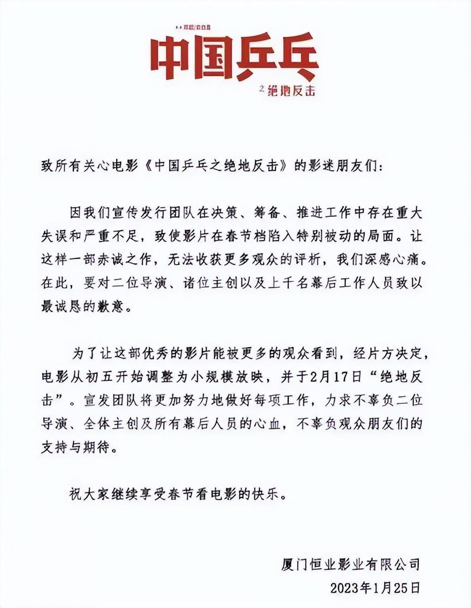 “因宣传发行团队在决策、筹备、推进工作中存在重大失误和严重不足,致使影片在春节档陷入特别被动的局面……电影从初五改为小规模放映,并于2月17日‘绝地反击’。”