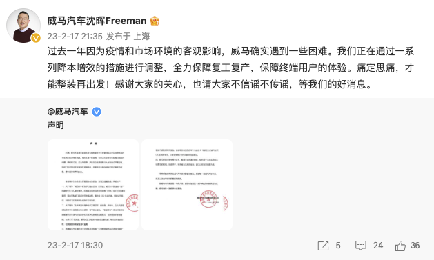 2月17日晚间,威马汽车官博发布澄清声明,否认公司财务部门擅自立项,“根据公司规定,财务部门无权限审批结款千万级项目”。声明称,所谓威马汽车离职员工对财务部门发表“公司管理层为自己项目开绿灯”的言论,均为主观臆测。此外,威马汽车否认公司智慧停车项目“靠黄牛刷单”,称相关数据长期保留且可追溯。随后,威马汽车创始人、董事长兼CEO沈晖转发该声明并表示,过去一年因为疫情和市场环境的客观影响,威马确实遇到一些困难,“我们正在通过一系列降本增效的措施进行调整,全力保障复工复产,保障终端用户的体验”。