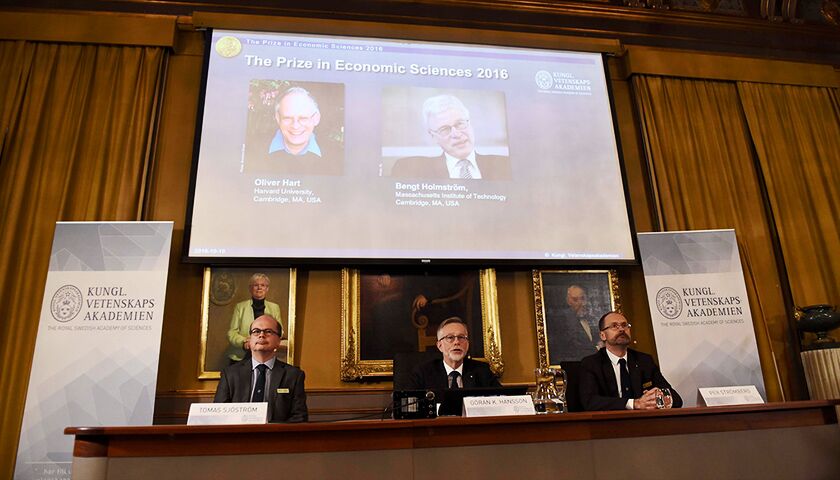 瑞典皇家科学院诺贝尔奖评审委员,于北京时间10月10日17时45分,在斯特格尔摩的Session Hall召开新闻发布会,公布2016年诺贝尔经济学奖获得者,分别是麻省理工大学的经济学教授本特·霍姆斯特罗姆(Bengt Holmstrom)和哈佛经济学教授奥利弗·哈特(Oliver Simon D'Arcy Hart),两人均是合约理论方面的领军人物。
