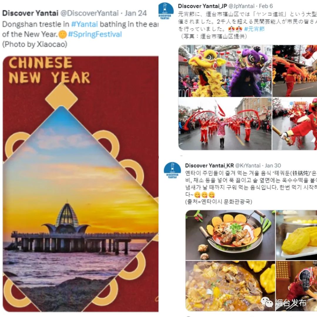 晨曦中的东山栈桥,扭进乡村的大秧歌,热气腾腾的美食……春节前后, “Discover Yantai”英日韩三语种推特账号,通过一个个海滨生活“小细节”,将活色生香的烟台丰富立体地展现在世界面前。