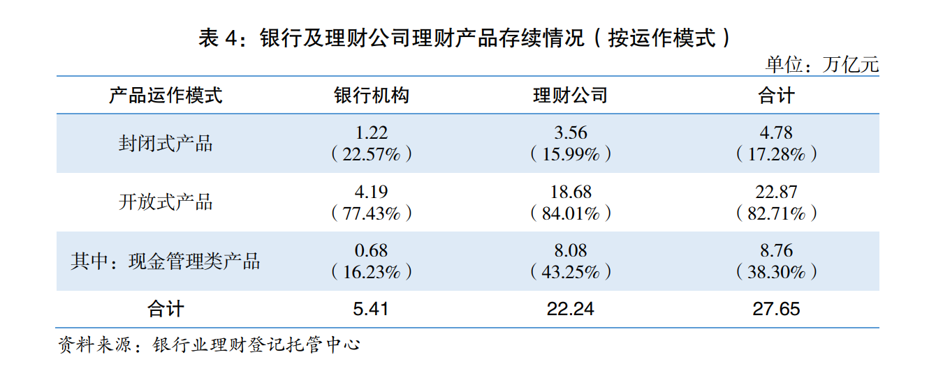 银行理财存续产品中,开放式理财产品存续规模达22.87万亿元,占比82.71%,较去年同期增加0.71个百分点;封闭式理财产品存续规模为4.78万亿元,占全部理财产品存续规模的17.29%。其中,现金管理类理财产品存续规模为8.76万亿元,较年初下降5.75%,占全部开放式理财产品存续规模的比例为38.30%。