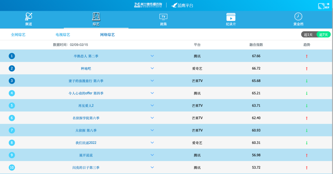 根据蓝鹰平台发布的融合传播指数,最近一周内,全网综艺(不包含电视综艺)Top10中,《半熟恋人2》轻松拿下榜首,腾讯视频和芒果TV各自入围4部,合计占据八成份额。