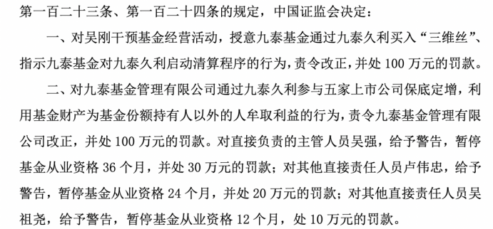根据处罚书可以得知,吴刚利用旗下九泰基金买入三维丝(现已更名为“中创环保”)年化收益率不低于12%的“保价”股票,证监会责令改正,因此被处罚100万元。