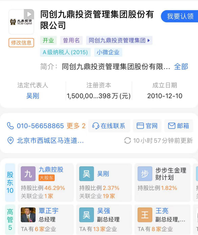 天眼查显示,九鼎集团成立于2010年,专注于私募股权投资管理业务,还先后设立了公募基金九泰基金,收购九州证券、中捷保险经济,吞并富通保险,投资借贷宝等互联网金融平台,业务布局迅速覆盖券商、保险、公募基金、私募等领域。