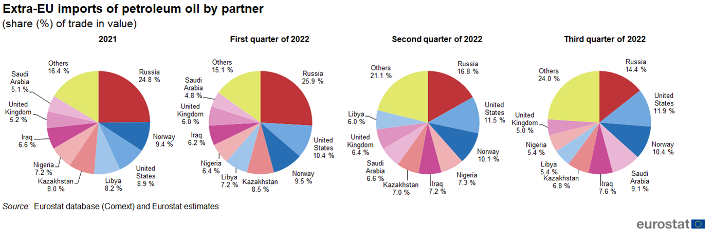 2021年,欧盟有24.8%的石油进口来自俄罗斯,其次为挪威(9.4%)和美国(8.9%)。但到去年第三季度,俄罗斯的占比降至14.4%,美国则升至11.9%、超过挪威排名第二。