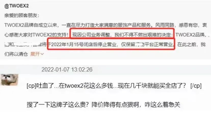 黄明昊个人潮牌“TWDEX2”运营不到两年,就关闭天猫、淘宝和抖音店铺,并顺便搞起了清仓大甩卖,原本一件售价1899元的镂空西装,699元的长袖T恤,纷纷降至99元、129元等低价处理,不少高位入手的网友吐槽自己成了“大冤种”。