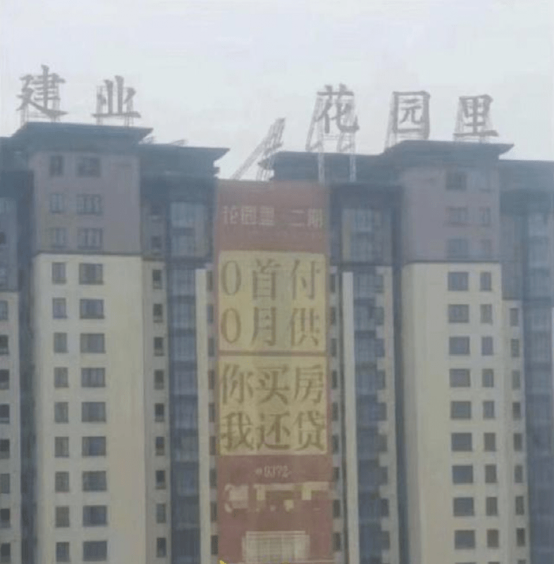 2月17日,河南安阳一楼盘挂出“0月供0首付,你买房我还贷”条幅,引发市场关注。图片上显示项目名为“建业花园里”,外界猜测开发商为河南本地龙头房企建业地产。