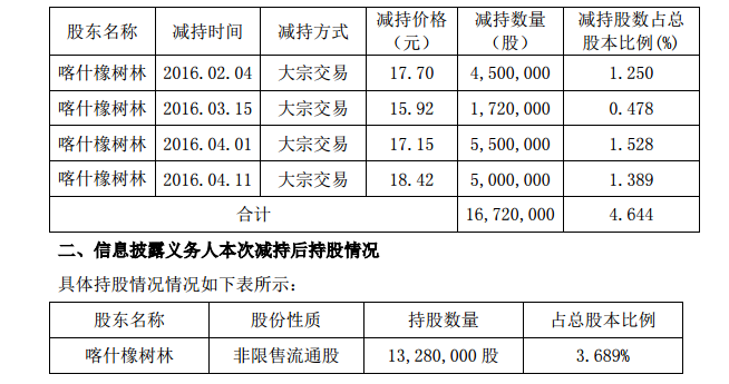 不仅是橡树林,一心资本、依惠发展这两家公司也分别在相同时间段内分批减持。其中,一心资本于2016年2月3日至3月29日通过大宗交易减持180万股,共计3.06亿元,减持比例为5%,减持后占股比例为1.67%;依惠发展在2月3日至4月6日期间通过大宗交易减持1081万股,合计金额为1.94亿元,减持比例为3%,减持后持股比例为4.78%。