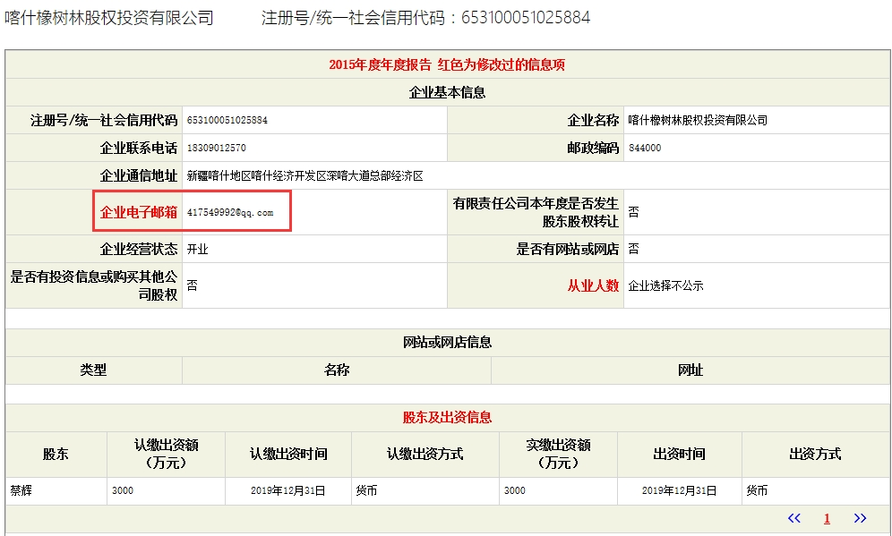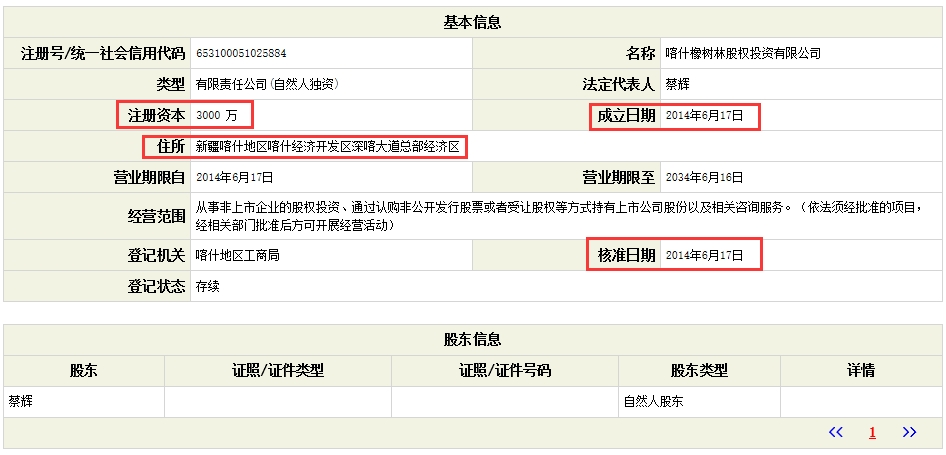 界面新闻记者经过查询工商信息发现,喀什橡树林公司为自然人独资公司。其法人为蔡辉。