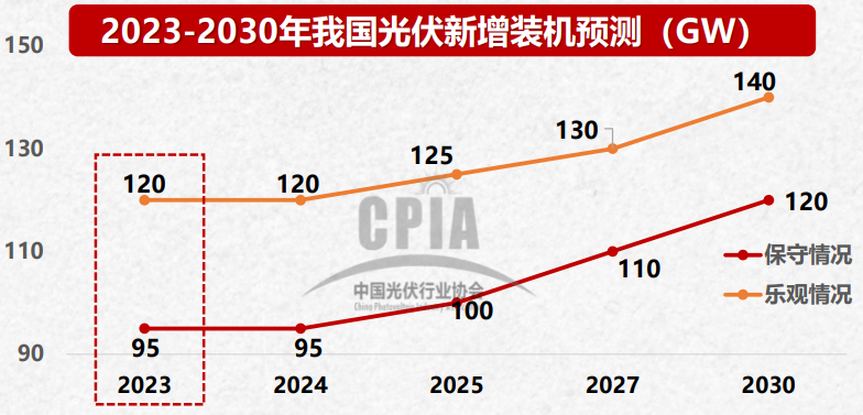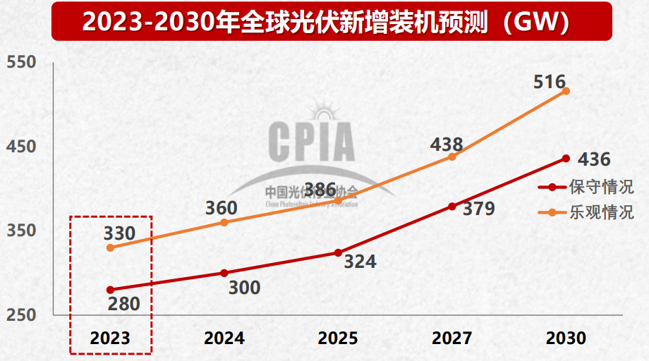 不过,中国光伏行业协会对于全球和中国光伏新增装机的预测,和李俊峰的观点相比偏保守一些,一并供大家参考: