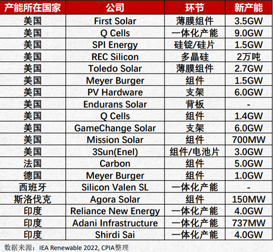 贸易壁垒+扶持本国企业,是海外国家发展本国制造业的组合拳。2022年部分国家规划的新增产能,覆盖多晶硅、硅片、电池片、组件、支架等环节,据不完全统计已超50GW。