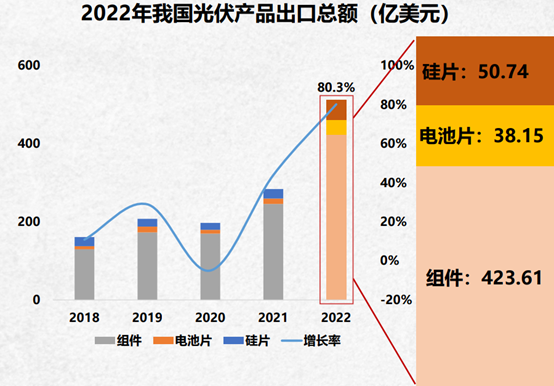 2022年我国光伏产品(硅片、电池片、组件)出口总额突破500亿美元,约512.5亿美元,同比增长80.3%。