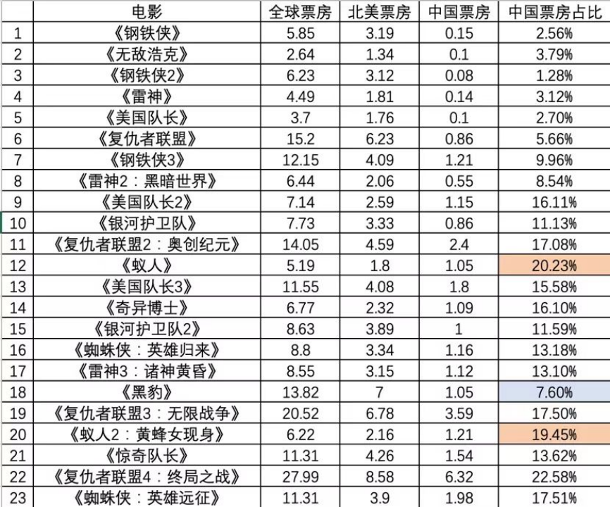 《蚁人》与《蚁人2》的中国票房占比均达到了接近20%,除《复仇者联盟》系列之外,是单人英雄电影中最高的两部,而最低的,自漫威第一阶段之后,就非《黑豹》莫属。