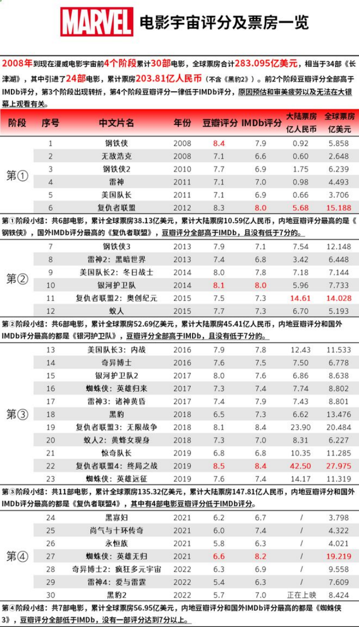即便是这群尚有兴致观影评分的核心粉丝,对第四阶段的影片质量也颇有微词。据后浪电影统计,漫威第一、二阶段影片的豆瓣评分全部高于IMDB,且没有一部低于7分;而到了第四阶段,局势则完全逆转,豆瓣评分全部低于IMDB,且没有一部在7分以上。