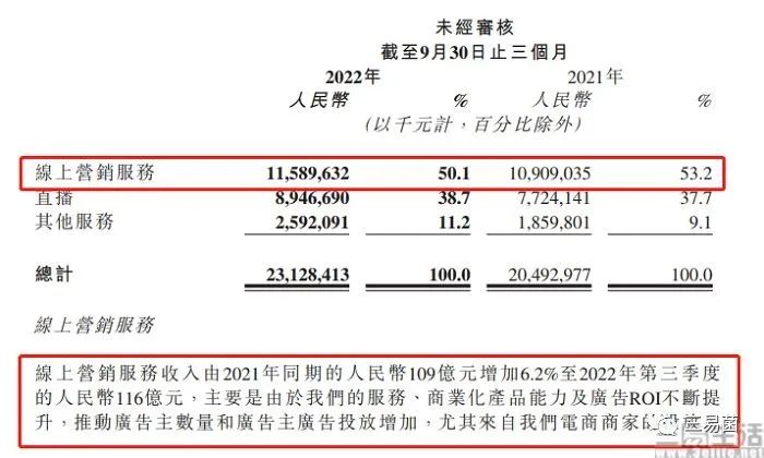其中以电商为例,据《晚点LatePost》此前的相关报道显示,2022年第一季度抖音有超过1/3 的广告收入来自这个业务。其实这一点在快手身上也得到了验证,在2022年第三季度的财报中该公司就曾明确表示,来自平台商家的投放是其广告收入实现同比增长6.2%的重要因素。