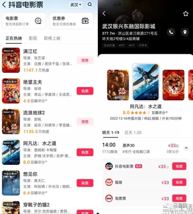 例如在2022年6月,抖音在APP顶部推出“探索”频道,内容则为以种草类图文和视频为主的双列信息流,与小红书极为相似;并将货架式电商的“商城”提升到APP的一级入口处,页面布局更是与淘宝、京东、拼多多几无二致。随后在同年10月,还推出了票务平台“抖音电影票”,使得用户无需跳转第三方小程序或APP,在站内搜索关键词即可购票。