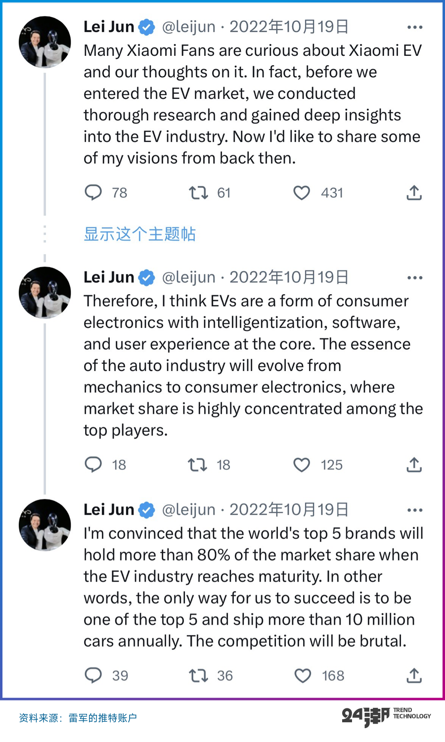 2022年10月19日,雷军在推特发文:“我相信未来在电动汽车市场非常成熟的时候,全球前五名的电动汽车品牌会拥有80%的市场,小米汽车想要成功就需要成为全球Top5,年产量超过1000万辆才行。”