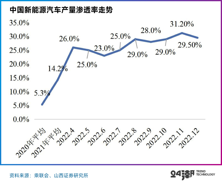 2022年,我国新能源汽车渗透率达到1/4(25.6%),提前三年实现了国家规划目标。2022年后三个月更是达到了30%左右,而这个数据在2021年1月仅为7%。