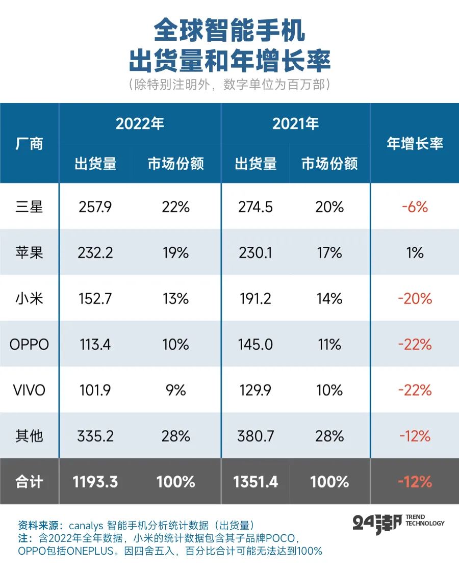 Canalys发布的数据显示,小米在2022年的出货量近1.53 亿部,同比大降20%,市场份额卫13%,排名第三。