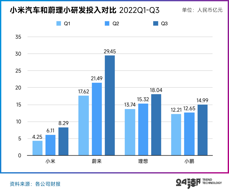2022年前三个季度,小米造车研发支出分别为4.25亿、6.11亿和8.29亿,合计18.65亿元。
