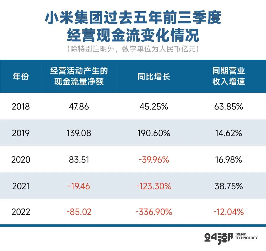 业绩恶化的同时,小米集团现金流出现明显恶化迹象。2022年前三季度,小米集团经营活动产生的现金流量净额为-85.02亿元,而2019年-2021年同期(前三季度)分别为139.08亿元、83.51亿元和-19.46亿元,下滑迹象非常明显。
